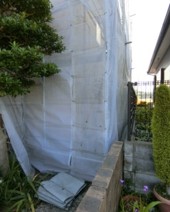周辺のお宅や植木、車などが汚れないよう専用のネットで足場を覆います。