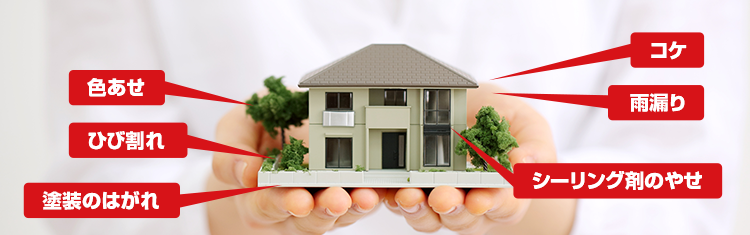 多くのお家の場合、上記の図のような現象が起きます。多いのはシーリングのやせ、コケや藻がついている、外壁塗装がひび割れしている、外壁塗装や屋根塗装が色あせしている、塗装がはがれているといった事でしょうか。